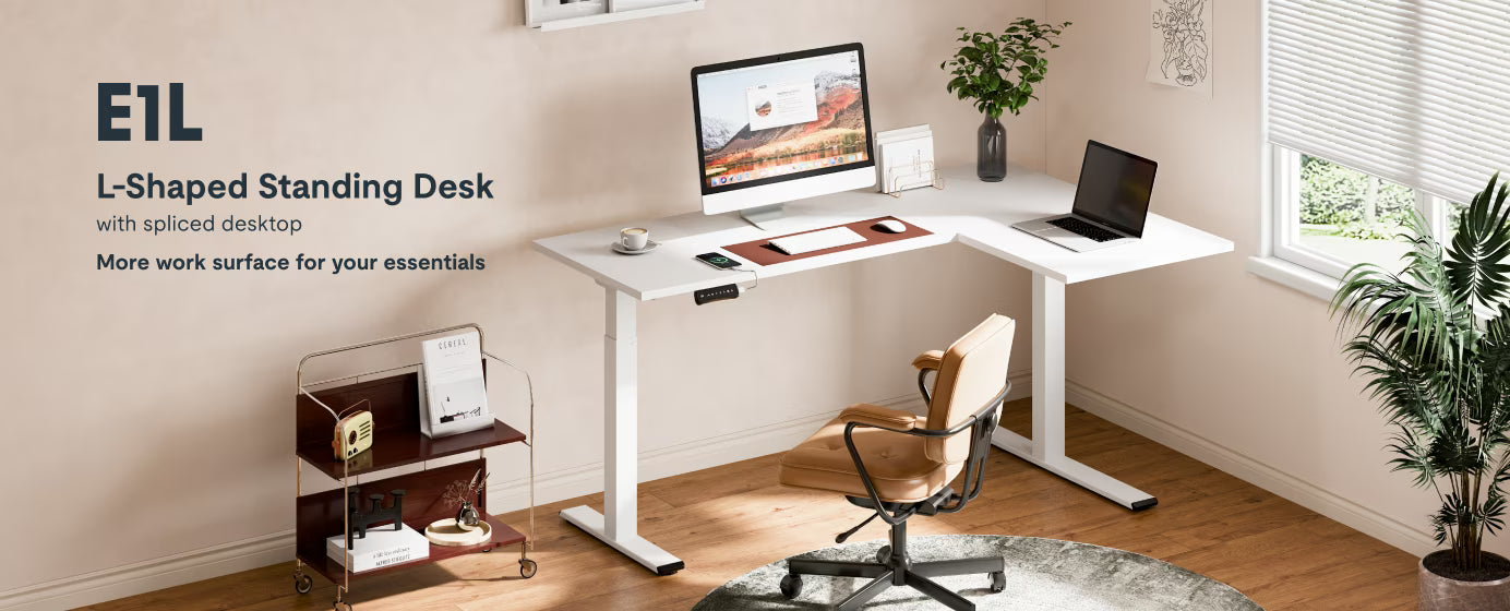 Mặt bàn làm việc hình chữ L lớn với các tấm nối được làm từ vật liệu thân thiện với môi trường, cung cấp không gian rộng rãi cho các dự án đang thực hiện và đồ dùng văn phòng của bạn.